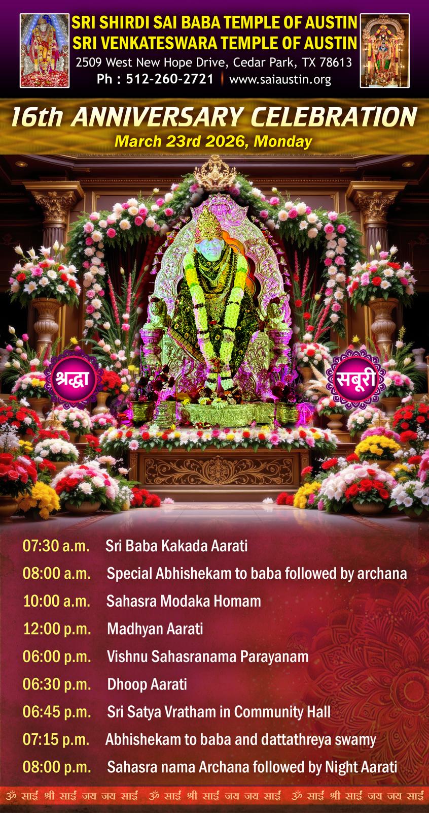 March 23, 2026 Monday Sai Baba Temple 16th Anniversary